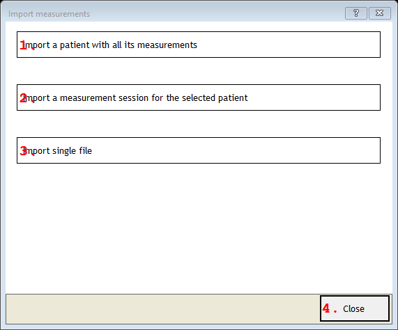 Opens a browser that looks for patients and for the measurement sessions of patients. Both patient and sessions can be imported.3. Import single file