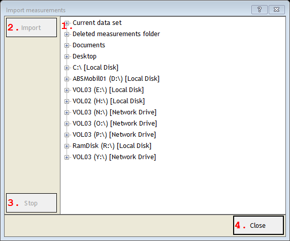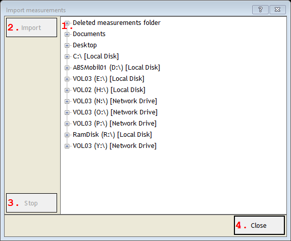 Click to import the selected patient or measurements. If you hold your mouse over the button, an information box is shown that summarizes what is going to be imported to where.3. Stop button