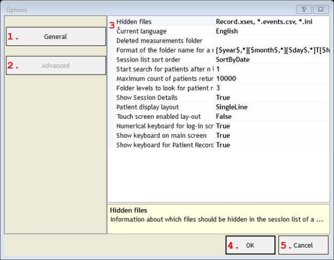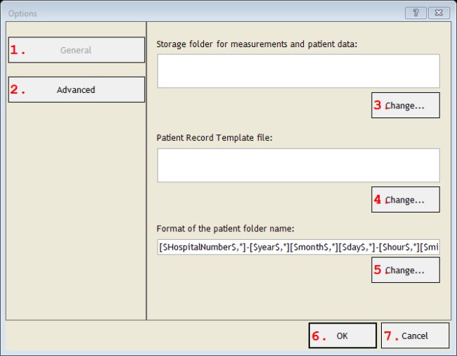 The most important setting is the Storage folder for measurements and patient data, which is a folder in which all new patient data and measurements are stored. The disk on which this folder is located should be large enough to hold many measurements. This setting should only be changed by a system administrator that is aware of the limitations of the computer system.