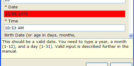 The patient data that are filled out are checked as soon as the user leaves one input field. If the input is not correct, either because nothing has been filled out although the field is obligatory, or the input is not formatted correctly (for example, a date that does not have the correct form), then the input field becomes red and a information field appears at the bottom of the dialog.