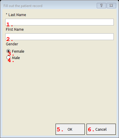 Accept the data entered for the patient. If any fields that have to be filled out are still empty, the dialog will not close.6. Cancel button