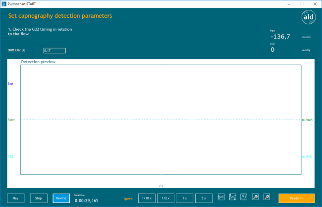 In this viewer the flow signal, the CO2 signal and the expiratory onsets resulting from the flow and pressure signal are previewed.