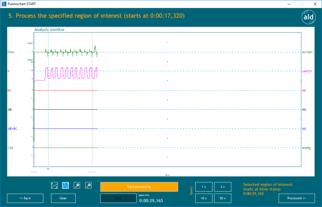 Beware: although data running could already be started, the final processing run (and storing of the analysis) is ONLY started when Start processing is pressed, which causes a reset of the Analysis monitor and data running starts at the begin of the selected region of interest.