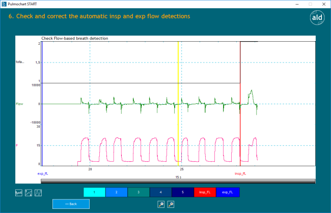 The final breath detection results can be checked and corrected. Therefore the inspiratory and expiratory markers can be modified and additional markers can be added to the signals.Details