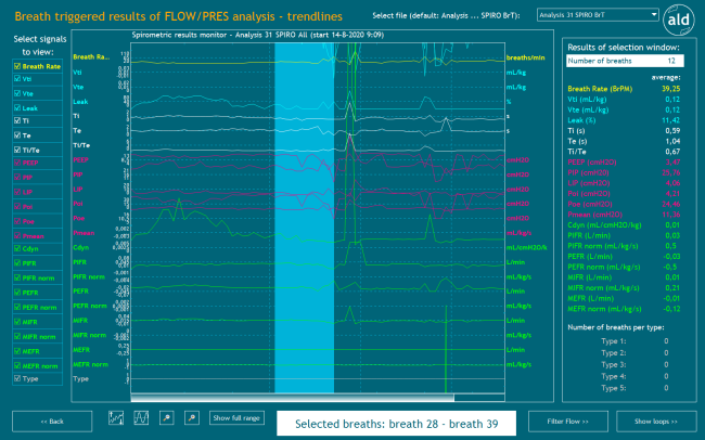 Breath triggered results of FLOW/PRES analysis - trendlines