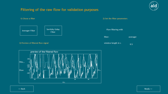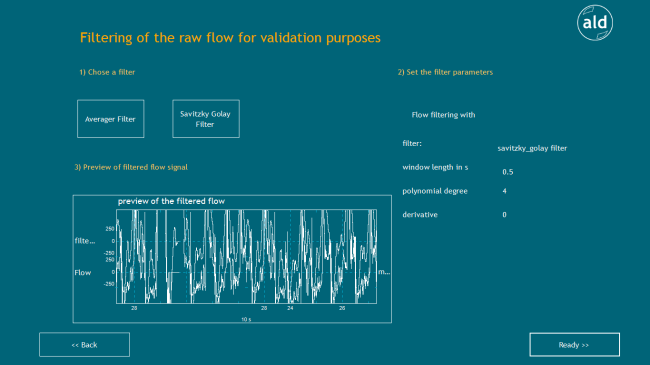 This button directs to a review of the filtered flow with the currently applied filter parameter setting ("Review filtered flow results"). Additionally, this filtered flow is stored in combination with the breath triggered results in a file called "...filtered_flow.csv".