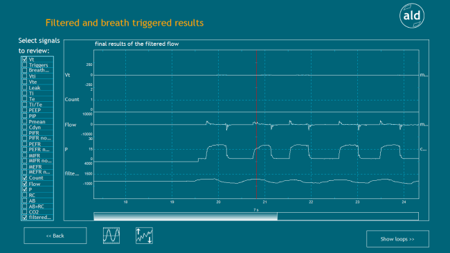 For validation purposes the filtered flow can be reviewed beside the raw flow and breath triggered spirometric results.Details