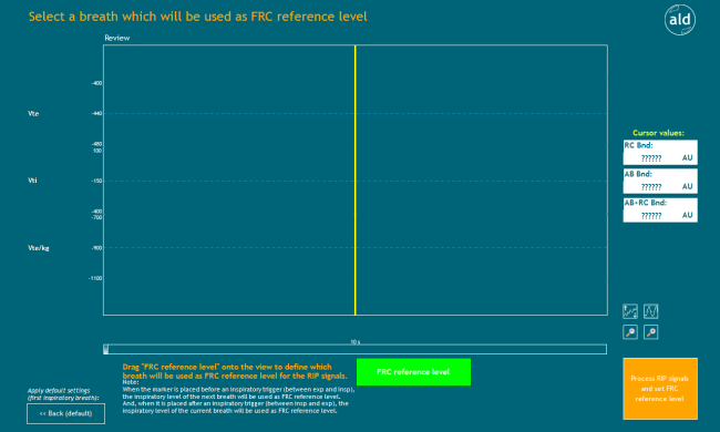 All breaths can be reviewed in a viewer. The current cursor values are displayed in a panel on the right. The desired breath is marked by dragging a green FRC reference marker onto the signals. Then the RIP parameter calculation can be continued by clicking Process RIP signals and set FRC reference level. The button << Back (default) directs back without setting a FRC reference level.