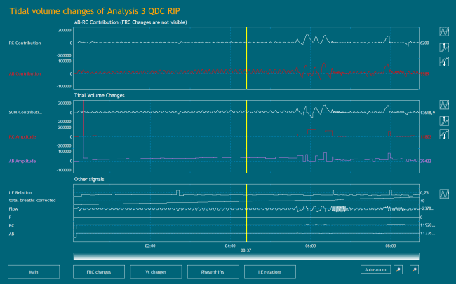 The tidal volume changes can be reviewed in different viewers indicating the abdomen and thorax contribution, the tidal volume changes and other signals: