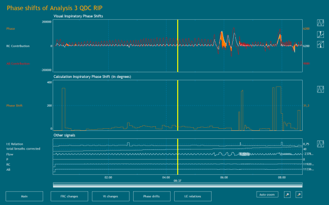 The phase shift can be reviewed in different viewers indicating the visual inspiratory phase shifts, the calculation inspiratory phase shift and other signals: