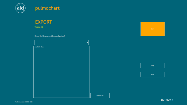 A source file with measured signals or Pulmochart results can be selected from the drop-down list. All available files are listed in the panel below, called Available files. Afterward, the analysis is started by clicking Start.